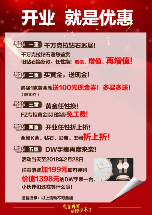 【兆龙分享】尊敬的VIP客人,非常感谢您的厚爱!兆龙珠宝泰盛分店将于12月29日重装开业。您参加预存199元领取精美DW手表的活动时间将从【29日- -2018年1月10日】,开业期间全场优惠活动多多,希望您能选择时间来店里参观指导![玫瑰]