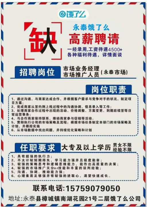 永泰诚招运营人员一名,负责服务之家外卖推广运营,有想创业的朋友请电话咨...